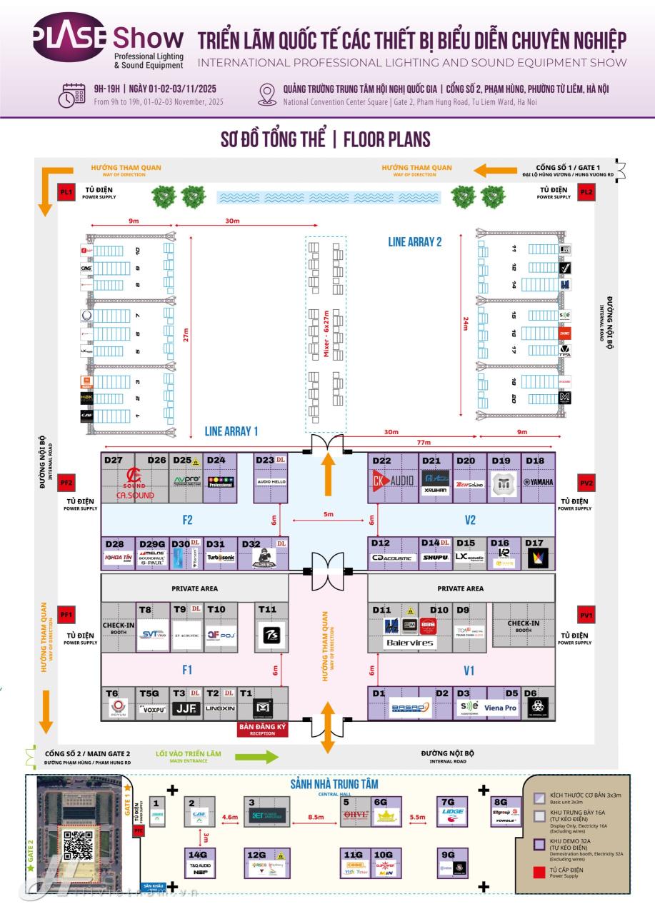 PLASE SHOW HÀ NỘI 2025 quy tụ hơn 60 đơn vị, chia thành 45 khu trưng bày có diện tích từ 36m² đến 135m², cùng 2 khu trình diễn line array ngoài trời với 17 hệ thống line array công suất lớn.